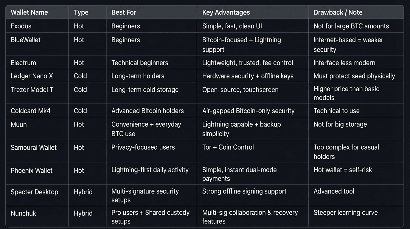 თითოეული განსხვავდება უსაფრთხოების დონით, ხელმისაწვდომობითა და მოხერხებულობით. მათი შერჩევა განსაკუთრებით იმაზეა დამოკიდებული, რამდენად ხშირად იყენებ ბიტკოინს ყოველდღიურ ტრანზაქციებში.