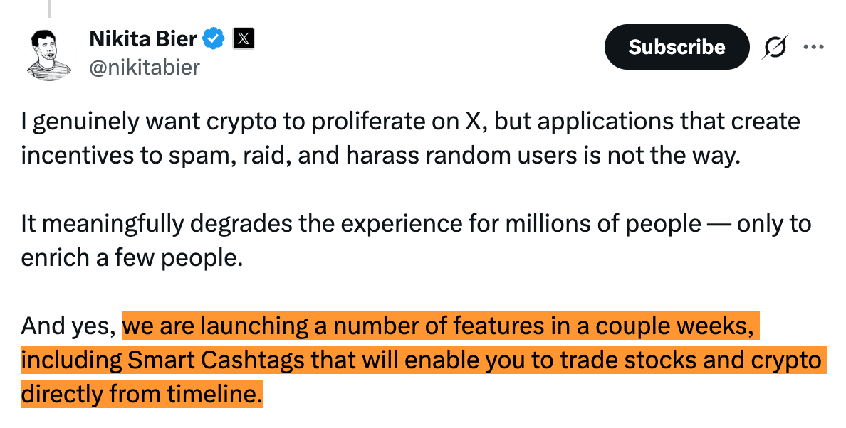 უახლოეს კვირებში შეიძლება გაჩნდეს შესაძლებლობა, რომ მომხმარებლებმა კრიპტო და აქციები პირდაპირ X-ის (ყოფილი Twitter) პლატფორმიდან იყიდონ. თავდაპირველად ბევრმა იფიქრა, რომ ტრანზაქციებს თავად X გამართავდა, მაგრამ ახალი ინფორმაცია უფრო იმაზე მიუთითებს, რომ გარიგებებისა და ტრანზაქციების უკან ტრადიციული კრიპტო ბირჟები იქნებიან.